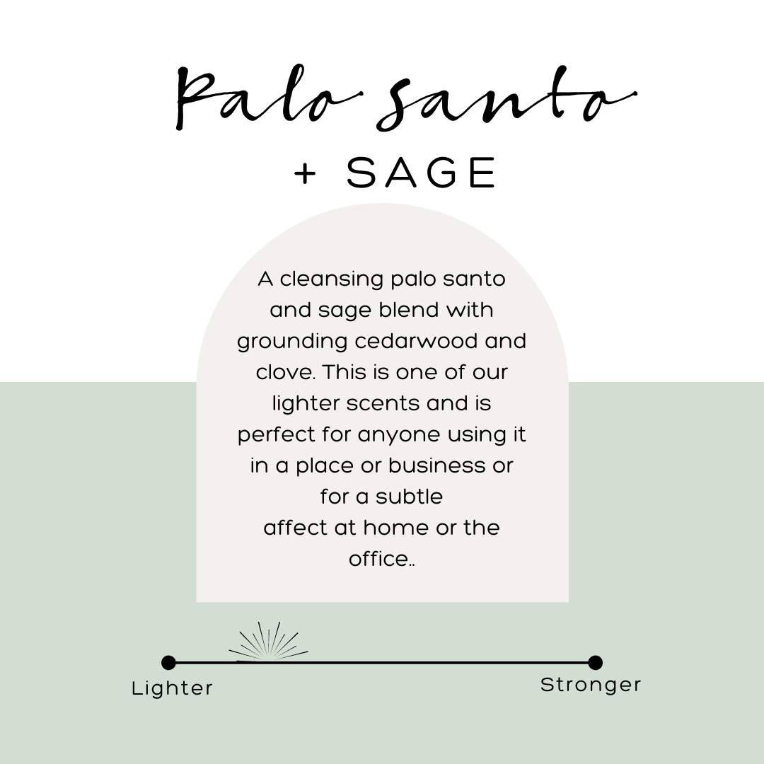 100% natural. A cleansing palo santo and sage blend with grounding cedarwood and clove. This is one of our lighter scents and is perfect for anyone using it in a place or business or a subtle affect at home.